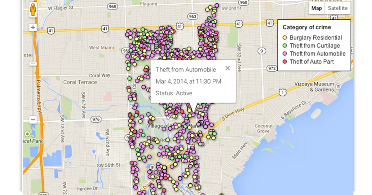 Four categories of crime accounted for 1,103 property crimes in Coral Gables over a one-year period, according to an analysis by the Coral Gables Police Department. Here is the breakdown of those crimes from Aug. 1, 2013, to July 31, 2014: 270 residential burglaries, 108 thefts from curtilage of residence (items taken from the area surrounding the home), 643 thefts from automobiles and 82 thefts of an auto part. Related story →